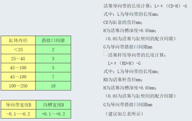 導(dǎo)向帶的幾何形狀一般多采用“矩”形扁平帶材.其厚度就根據(jù)活塞或缸體的溝槽深度與缸體與活塞或活塞桿間的配合間隙總和的0.05mm負公差.即h=H-0.05mm。導(dǎo)向帶的寬度則為溝槽寬度-0.1~0.2mm。導(dǎo)向帶的接口則采用45°或60°的斜搭口為宜。
